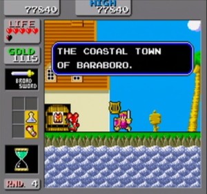 As mentioned before, the gameplay of Monster Land is very different to Wonder Boy. Players begin wearing nothing but their pants and they are not even in possession of any offensive weaponry. Could our supposed hero be any more ill prepared? The heads up display for the second title is far more important than it was prior. In the arcade version, the players life energy, gold and possessed items are all displayed in large grey boxes placed around the top and left edges of the game screen.
