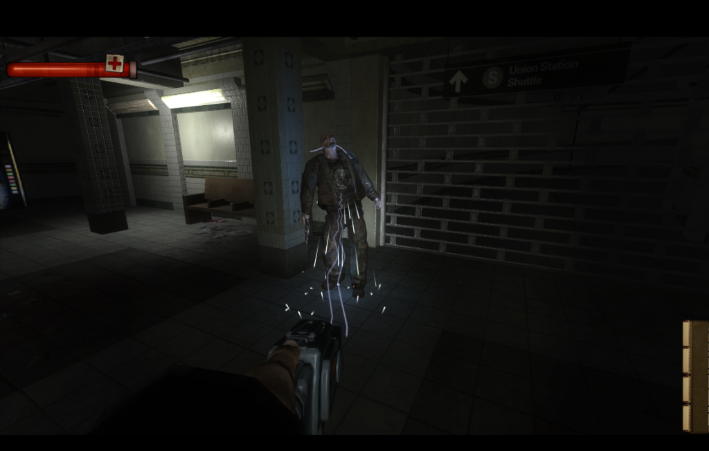 After all, shooting enemies from a distance is no where near as satisfying as bashing their skulls in with a steel pipe that you ripped off a wall. The game features over a dozen Melee weapons, the general principle is that if it isn’t nailed down you should be able to turn it into a weapon. I was particularly surprised when an enemy ripped out a subway sign off the wall and started swinging it around as a weapon. Even fire arms can be flipped into meelee weapons once you run out of bullets. All the weapons in the game are also dynamic as they take damage and wear and tear as you use them; they also get drenched in blood when you bash skulls with them.