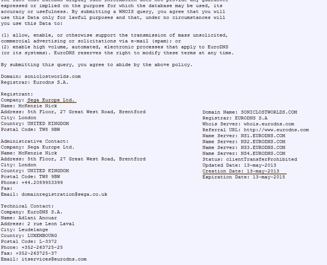 But we now know, via TSSZ, that SEGA Europe has also registered for the domain names: www.soniclostworlds.com and www.soniclostworld.com (noted in one of the images above). So far those two domains (if you type them in) go to a completely blank page, but that does show something – as if they weren’t registered my browser flags it up as an incorrect URL typed in.