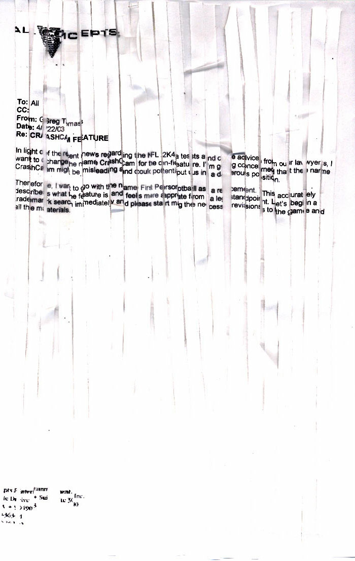 “An older memo that mentions not only the beta test, but SPECIFICALLY a beta test for NFL 2K4 in Orlando, to be conducted by Sunshine survey systems,” he wrote. “Also mentions that the test will study the game’s effects on “non-participating observers” which explains why the other guy wasn’t playing. We now have proof that Sega conducted the beta test in Orlando on March 22, something they specifically denied IN PRINT.”