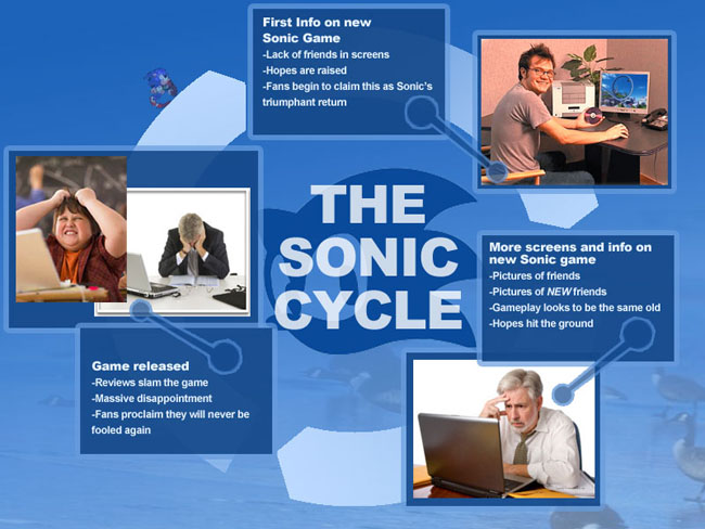 Not too long ago, my buddy Jason showed me what was called, “The Sonic Cycle”. To make a long story short it shows what phases Sonic fans go through when a game is announced, which is excitement, the thoughts on the game when the trailer shows up, to which fans usually say “Oh my god, this is going to be the best Sonic game ever!” and then the reaction upon release, which as of late has been a disappointment. This game follows that formula to a tee. It’s no Sonic ’06 in terms of being the worst Sonic game, but this definitely isn’t the step in the right direction.
