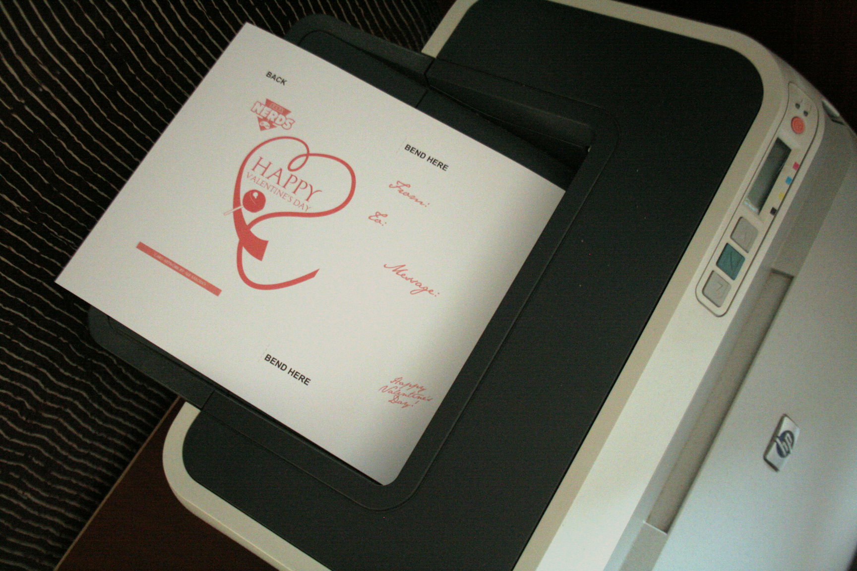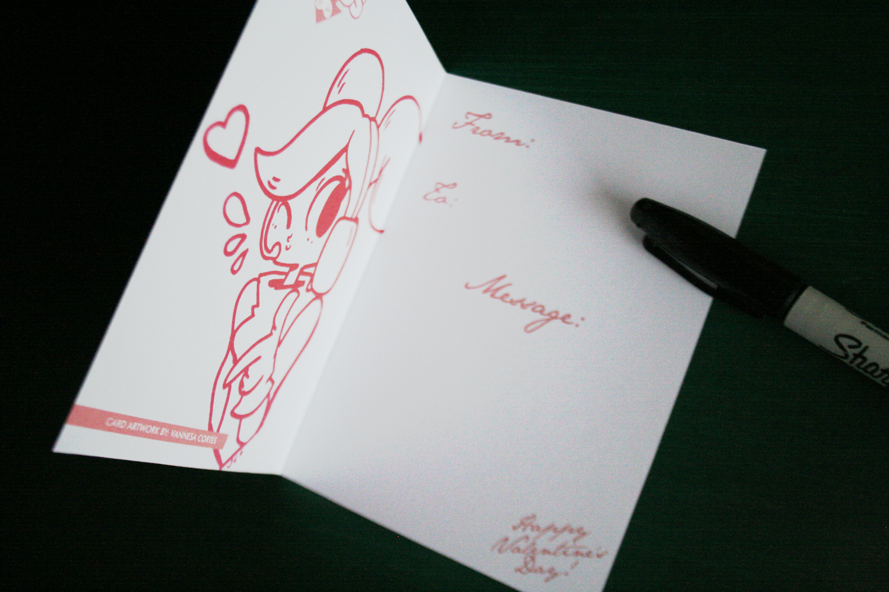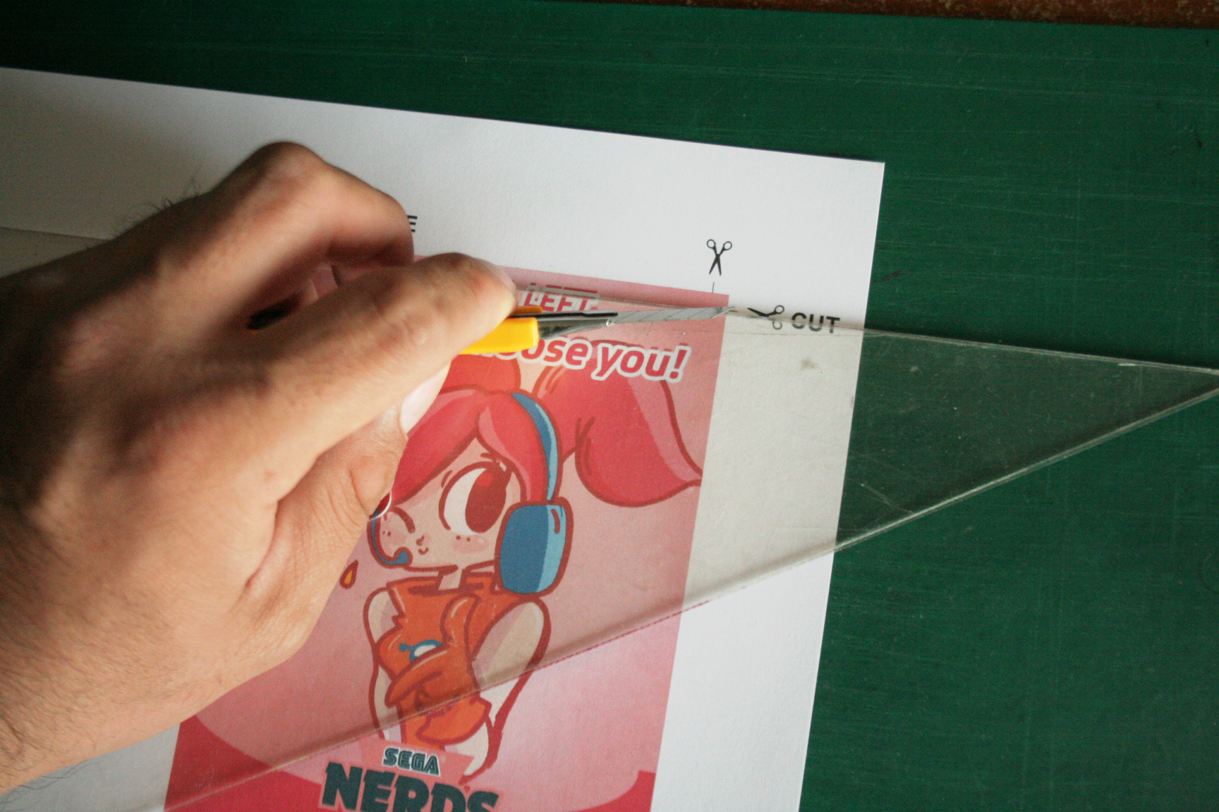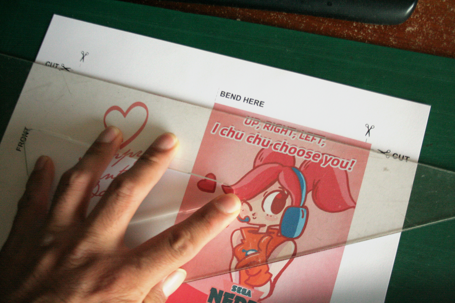 Once this is done, you’ll need a ruler, a cutter, and a surface to scratch. Align the ruler using the cross marks printed on the edges of each side of the card, cut from side to side. If you have problem with cutters, you can trace a line with a pencil from point to point and use scissors too! There is some space bleed on the print so you won’t miss. Fold the paper in half using the printed dotted line as a reference on each point for it. Fill in with a pen or marker what you want to say in the card, and it’s done!