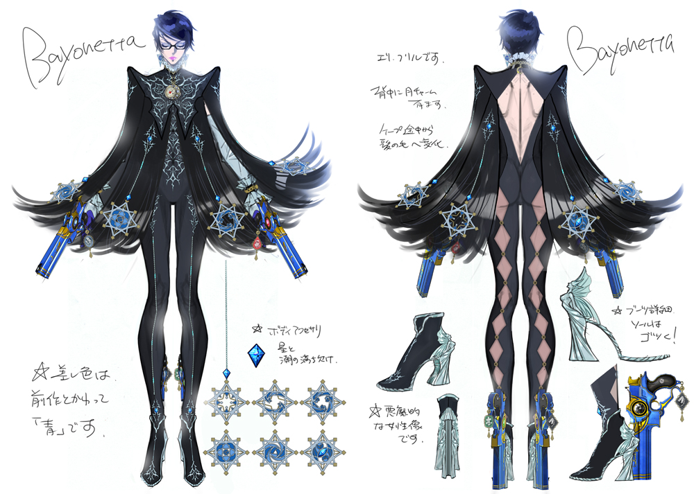 First take a look at the amazing character design and costumes Mari Shimazaki did for Bayonetta 2, her work shines as usual! Click on the images for a bigger view.