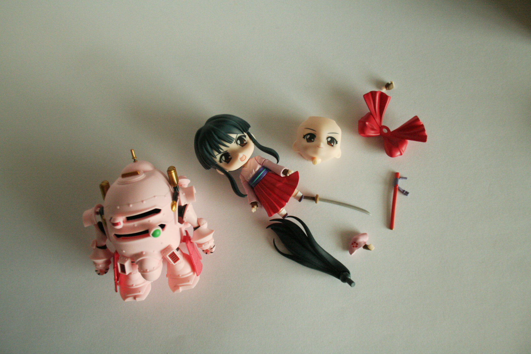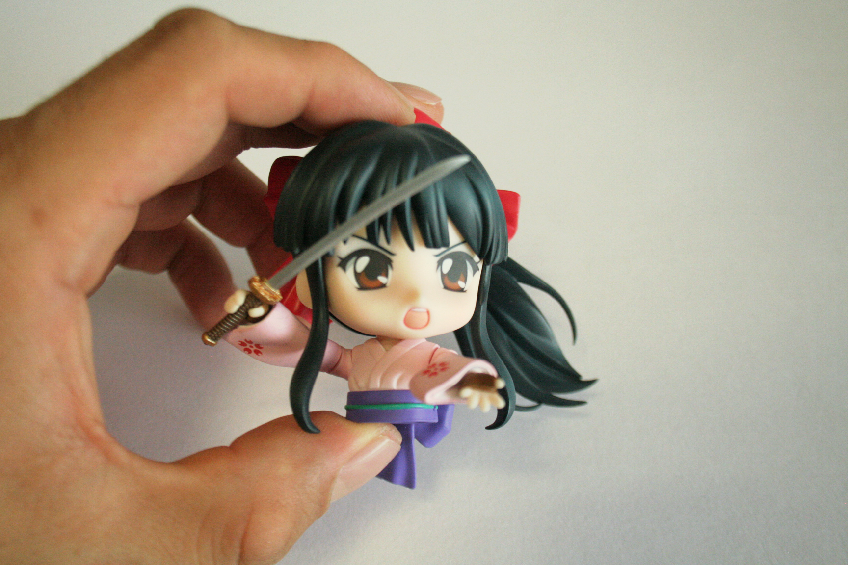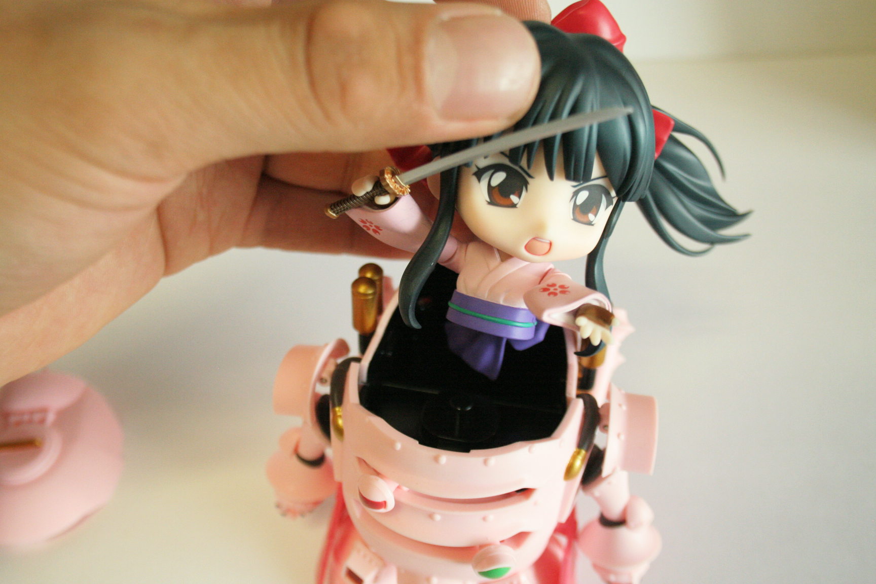 This chibi Sakura version has accesories like her sword Arakata (perfect for shouting “Ouka Houshin!!” while making her pose with it!), which sadly can’t be stored in the plastic Saya. The extra arms and hands are perfect for a couple of poses.