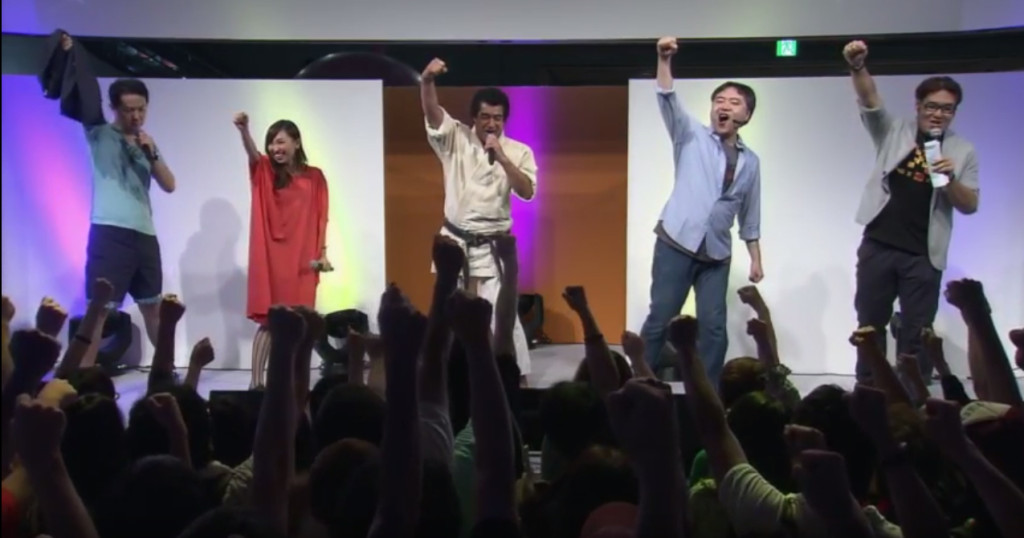 Hirsoshi started to throw in come jokes and nostalgia anecdotes, to which the crowd eagerly replied and clapped. Tsukanaka and Morizumi then explained the character selection for the game, and started to show some gameplay battles, of course, the selected Segata Sanshiro to show his combos, then the crowd went wild again. The producers showcased some new characters from Xenosaga and that other company that starts with a small “n” we don’t care about… Fire… something… whatever… not important… Oh yeah! SEGATAAAA!!! The developers showed some of the preorder bonuses for the game like some rad posters exclusively available to certain Japanese stores, and the special Capcom, SEGA, and Bandai Namco mugs that will be exclusive to each company’s online store. The Bandai Namco team told the audience a PXZ2 demo is coming.