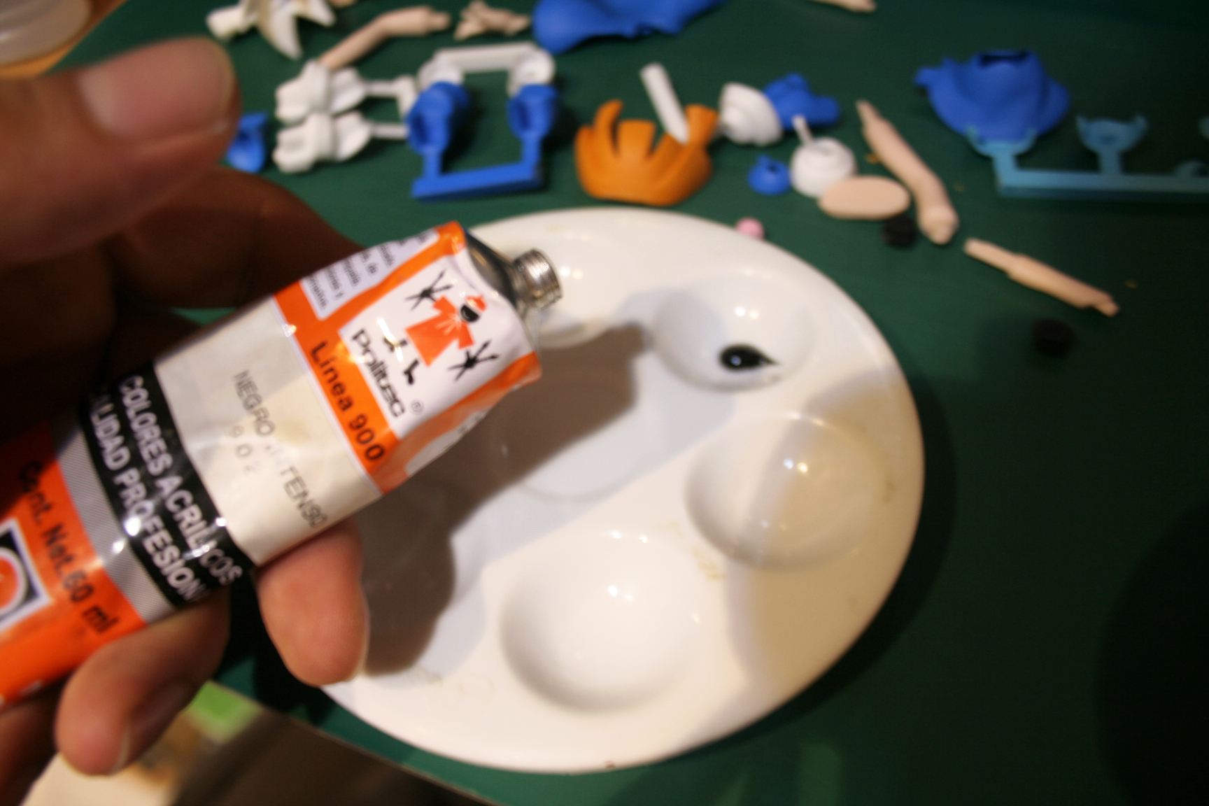 The next part must be the faces, which require more care than the rest of the parts, we start by detailing the faces with a small thin brush, I used the Acrylic Vinyl paint because when it is still fresh it can be easily removed with alcohol or water in case you make a mistake, which might happen very often on small areas that require precise pulse. Once the face structure is done, we add the stickers to the eyes, since this is a small area and your fingers might become clumsy, I recommend fixating the stickers with the cutter, just place the sticky part on the razor edge, and remove the cutter once the sticker has made contact with the eye holder surface. We add the hair parts and glue all the head together. However the head must be the last part to be glued to the body, I’ll explain why in a few.