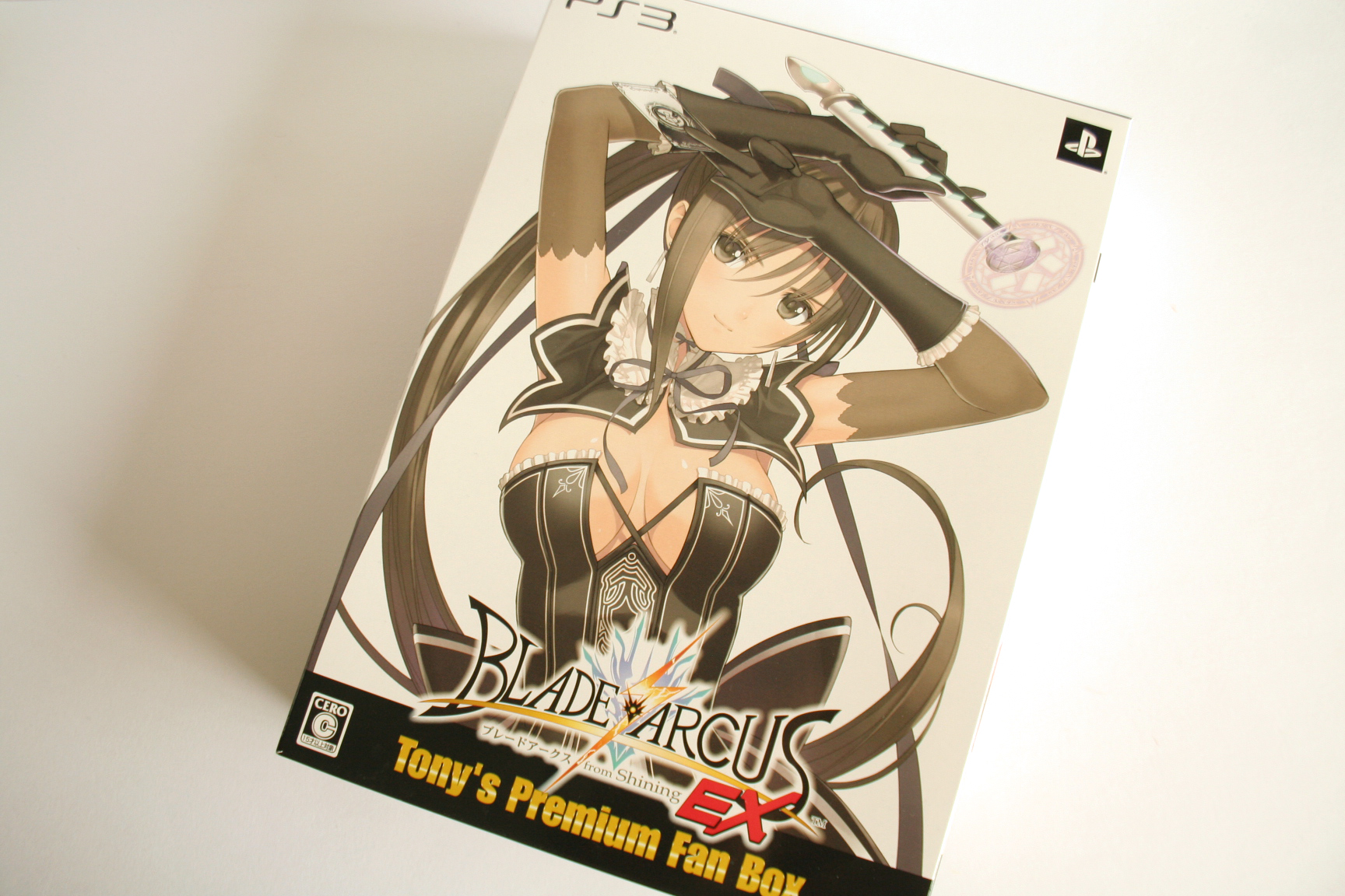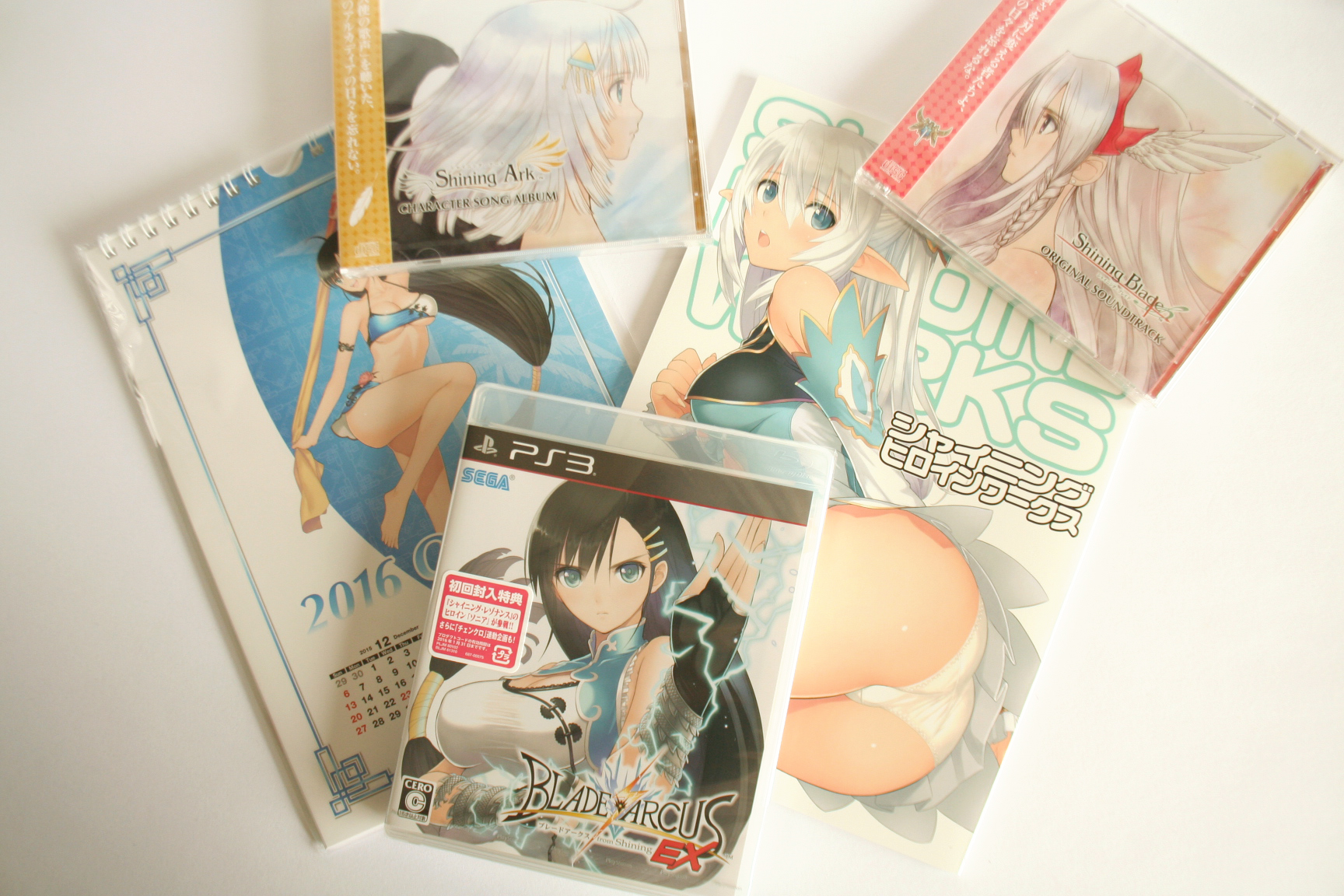 We got some games for this month, starting with Blade Arcus from Shining EX, a Shining series fighting game, and man, the release version sure is packed, it comes with a lof of goodies, including: a calendar, the game, 2 soundtrack cds, and an artbook illustrated by Shining series character designer Tony Taka: