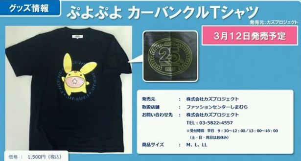 Fashion Center Shimamura will release a Carbuncle Puyo Puyo 25th Anniversary t-Shirt on March 12th, 2016 for 1,500 yen.