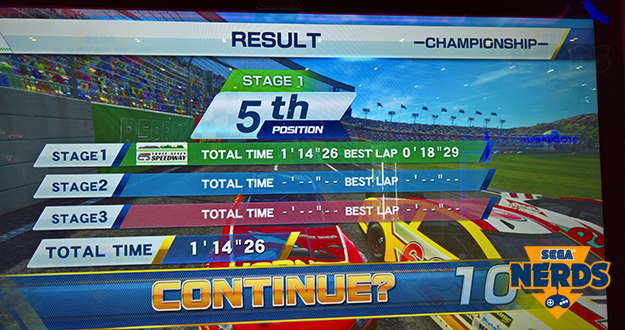 They also had the ‘Championship’ mode available to select – but it wasn’t working properly. The game stated that in Championship mode, you race across three tracks one after the other and see where you rank at the end. The mode loaded up and I did get to race one track (which you don’t get to choose – it seemed to be set to Daytona International Speedway) but then it was game over. I tried again, in case I didn’t rank high enough – but even when I came 5th in the race (probably the highest rank I’ve ever achieved in a Daytona arcade – because I generally suck), the game still told me it was game over.