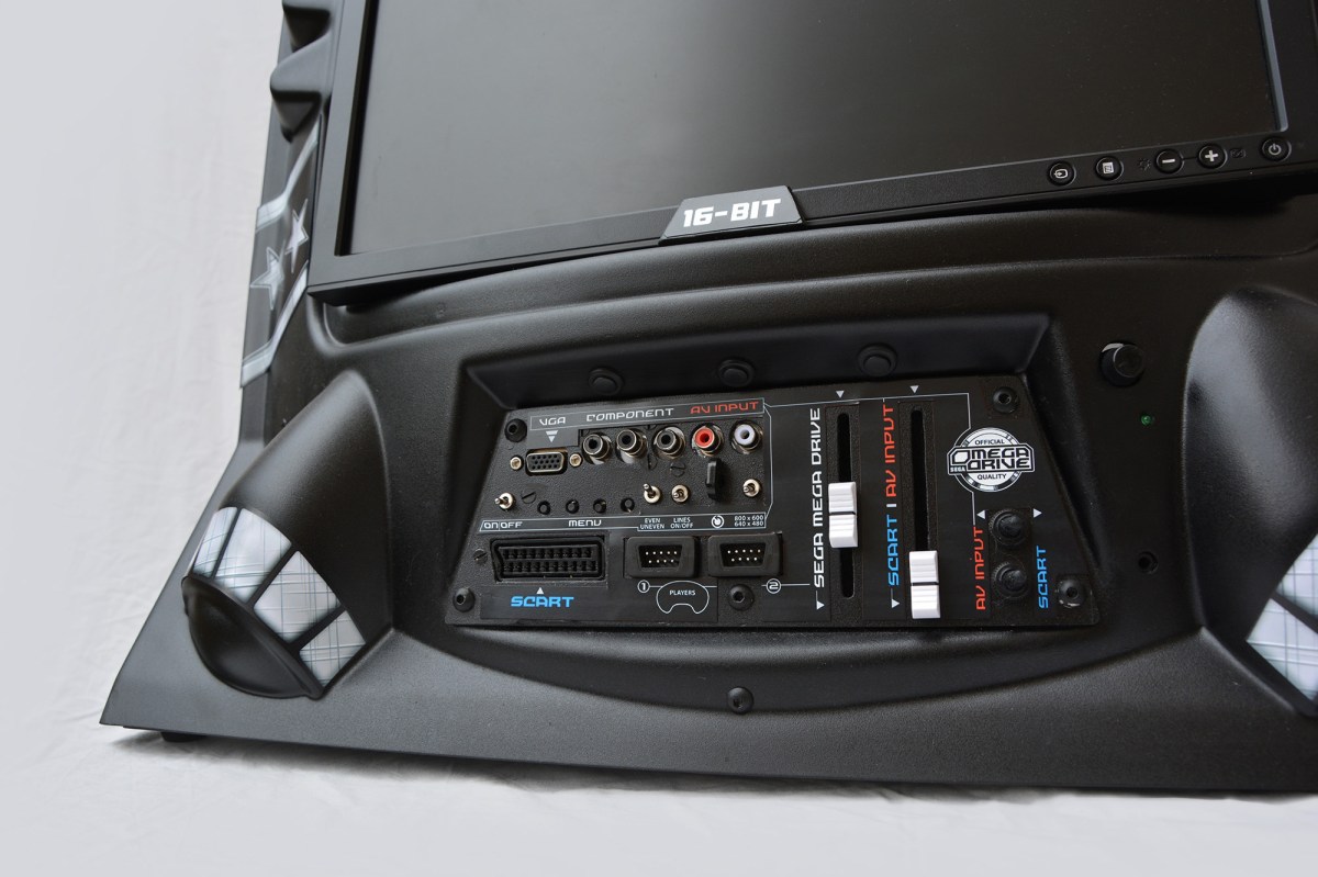 “The real power lies behind the control panel, which houses an array of video input options, all needed to play those classic video game systems. SCART, VGA, RGB, YPbPr and even HDMI inputs run through internal scanline generators to pump out an awesome arcade experience. Two faders allows for a greater control of the stereo sound from the Genesis, SCART or RCA audio input, while an additional HMDI-output allows this system to run the Genesis in parallel to a connected second console on a second screen! A power port at the side means any console can just be plugged into a video input port, and powered by the system itself – no extension cords needed.”