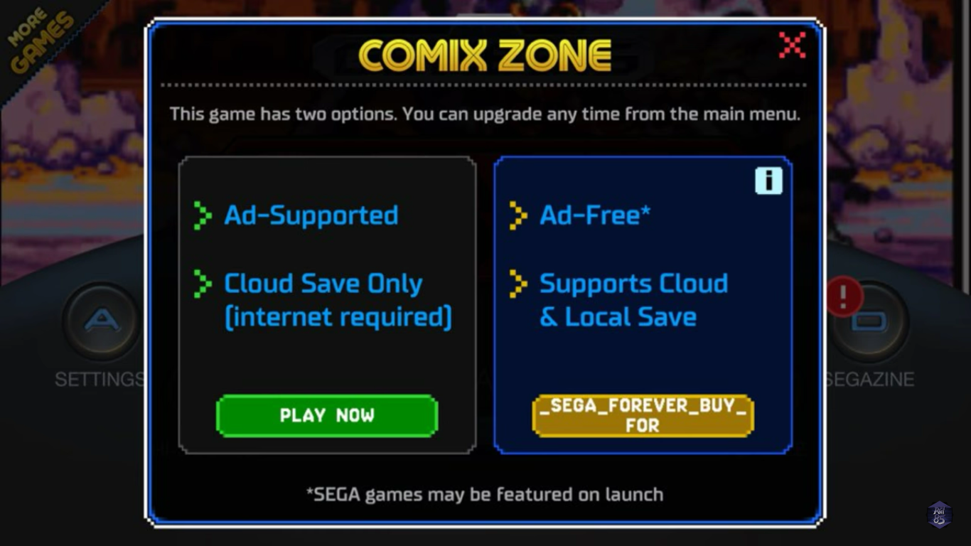 Upon clicking the “AD-FREE” button, you’re taken to a screen that explains the game has an ad-supported and ad-free versions. The ad-supported version only has cloud-save support, but the ad-free version supports cloud and saves with a purchase button that has the words “SEGA_FOREVER_BUY_FOR.” There’s also an asterisk that reads “SEGA games may be featured upon launch” for the SEGA Forever version.