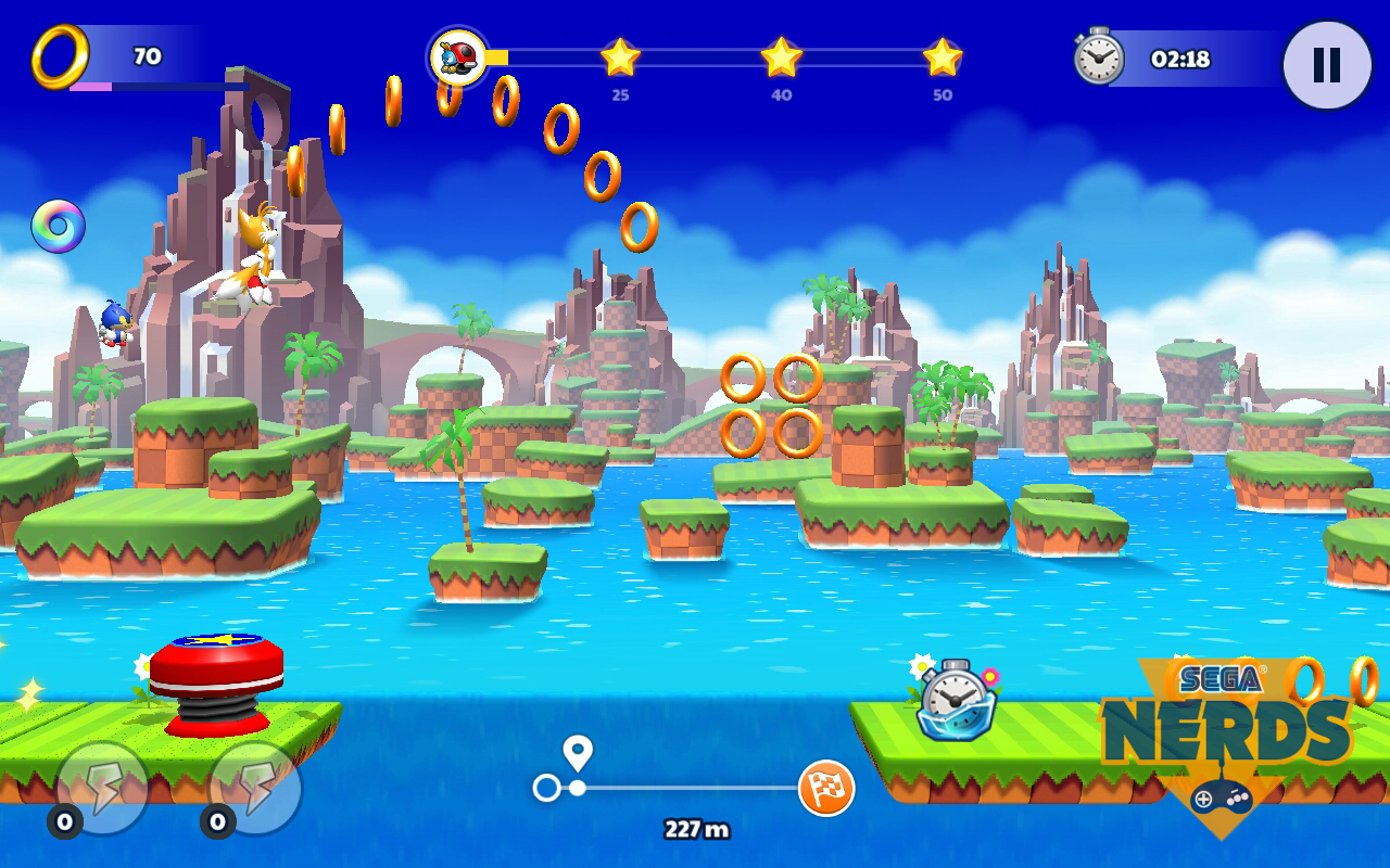 The way levels play out is different too, adding to gameplay variety. Some levels you go from point A to point B and need to achieve a goal in order to earn stars and unlock the next level. But some levels have you run laps, where you repeat the level 3 times – now wait – on paper it sounds bad, but it works really well, as it offers you a chance to explore new routes on each lap and any rings you previously picked up are no longer there, making it more of a challenge to seek out the different paths a level might take.