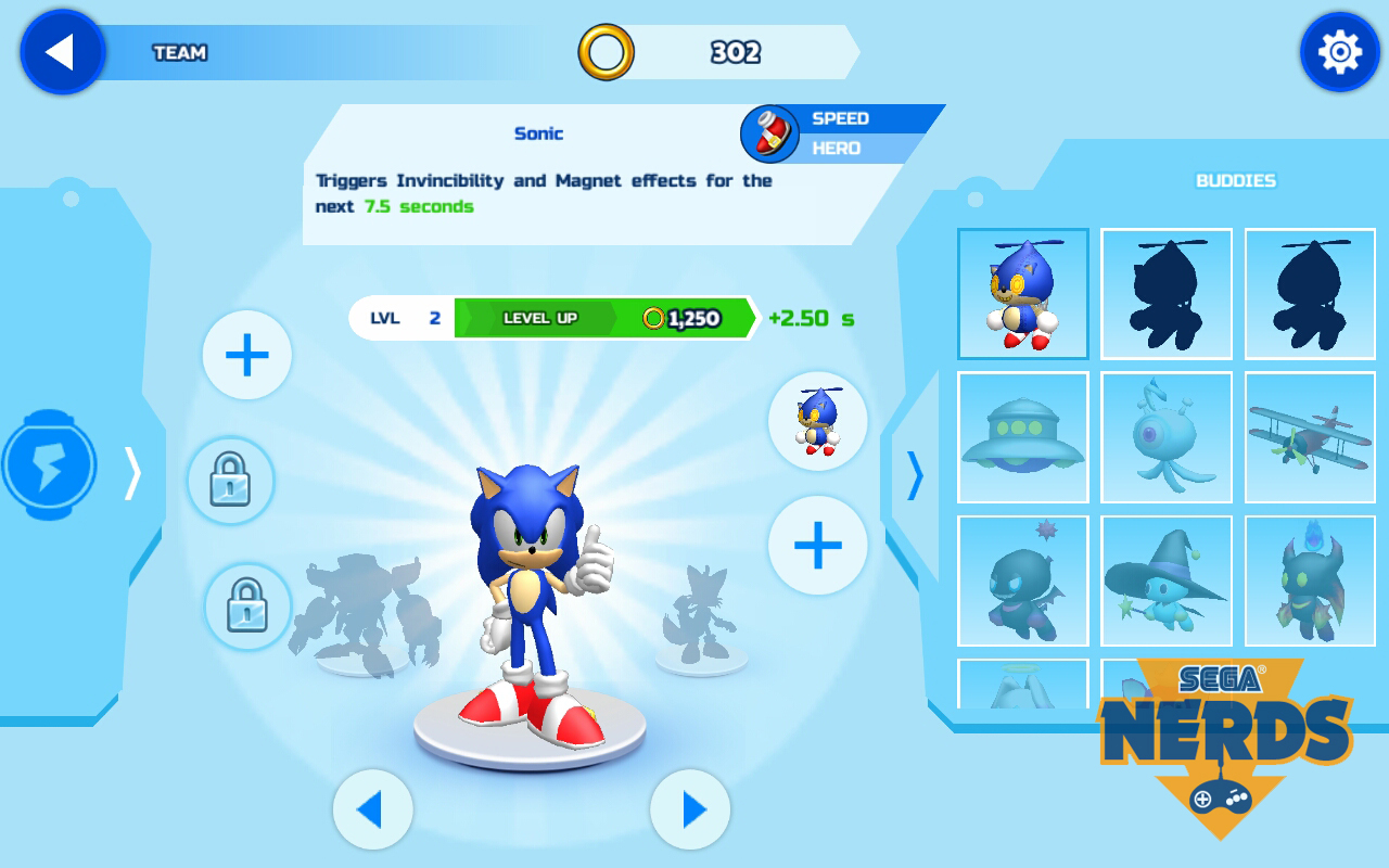As you progress through the game, you also unlock new characters across three ‘teams’, similar to those found in Sonic Heroes. Each team has three playable characters who have slightly different play styles: Speed, Fly and Power.