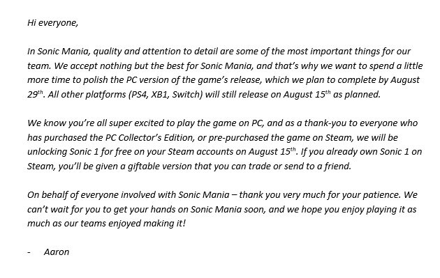 The team behind Sonic Mania (Headcannon, PagodaWest Games, and Christian Whitehead) have issued an apology to everyone who pre-purchased Sonic Mania on Steam or the PC Collector’s Edition. Sonic Mania is still planned for release on August 15th for the Xbox One, PS4, and Switch platforms. However, PC players will have to wait until August 29th.