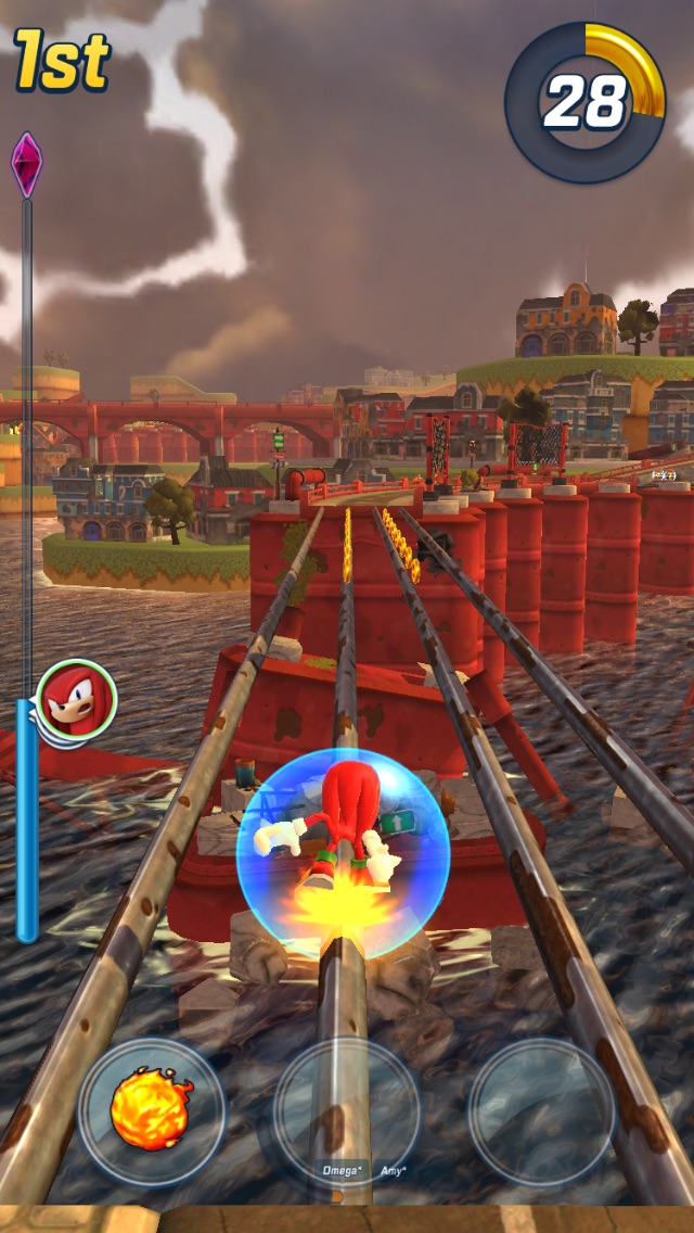Each character has a set of special abilities for each of the following slots: projectile, a speed boost, a barrier and a shield. Each ability has a unique look that fits with your chosen character, but they’re all essentially the same item, just with a different skin. One exception, however, is with Knuckles, Vector, and Omega as their speed boost is replaced with invincibility.