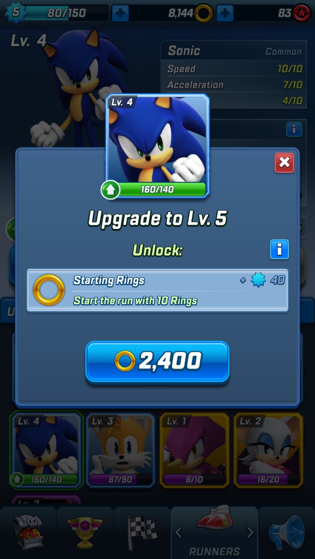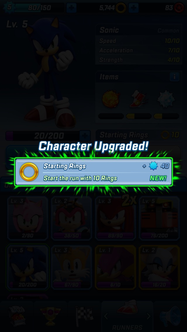 Beginning the game, the first character everyone starts off with is Sonic. To unlock the rest of the cast of characters, you must finish a level in first place, where you’ll be rewarded with a chest. Now, just because a chest contains a character, it doesn’t necessarily mean you get the character right away. You see, all characters start off at Level 0, and you must level them up to a Level 1 before they become unlocked. It’s a weird gimmick, but unlocking the characters goes by super fast.