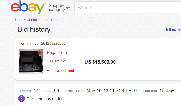 SEGA Pluto eBay auction ends at $15,000… reserve still not met